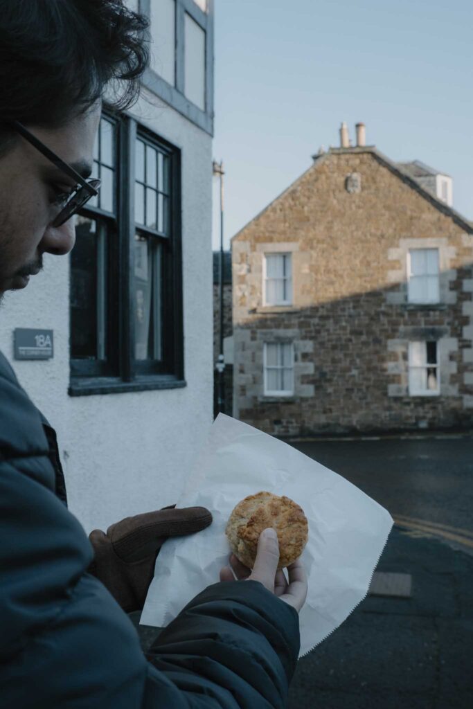 We leave Aberlady village and head eastwards along the coast. A handful of cars are already parked outside the Aberlady Bay Nature Reserve, and walkers and birdwatchers are on their way into the dunes. We follow the signs for the John Muir Way and walk inland along a noisy motorway. We are headed to Gullane, another charming East Lothian village. At No. 10 Bakery, we pick up a delicious cardamom knot and enjoy a moment of rest in the wintry sunshine.