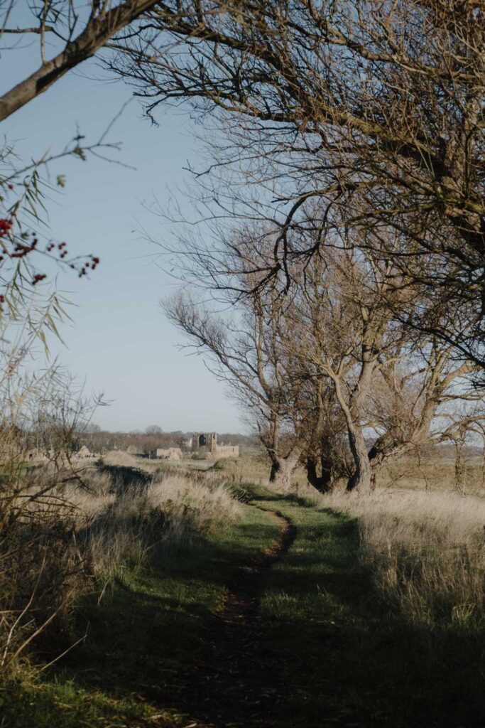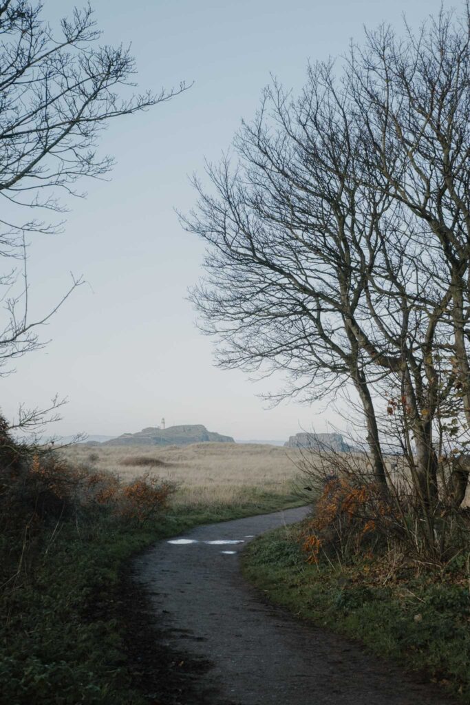 But we pressed on, knowing North Berwick was waiting for us, though we lingered a few extra minutes to take in the view. The route turns inland from Yellowcraig, and suddenly you’re walking through farmland. Rolling fields stretched out on either side, and we felt the landscape open up around us. A horse in the distance watched us curiously, ears pricked, while sheep scattered as we approached. The path was well-marked and easy underfoot, winding through small sections of dense woodland where the light filters through in golden shafts. There’s something deeply restorative about the quiet of East Lothian’s countryside: just the wind in the trees, the cry of birds overhead, and that ever-present distant sound of the sea calling you forward. You can feel the space here, the room to breathe. Walking this stretch, you’re very aware of being caught between the inland quiet and the coastal energy you know is coming.