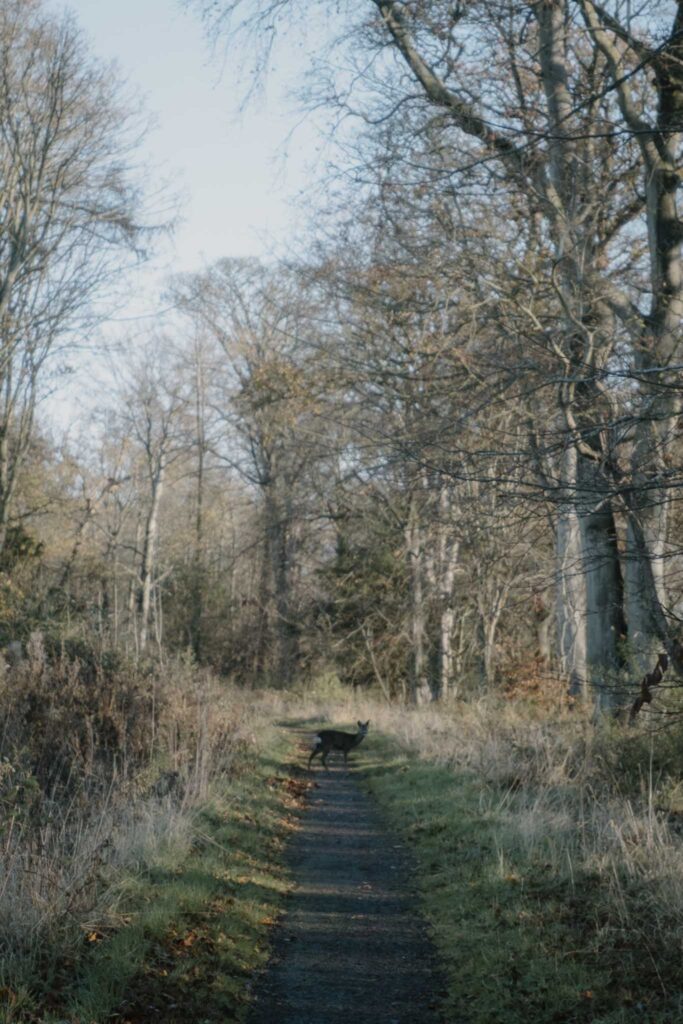 Up next, the gates of Archerfield Estate. We walk through the gates and walk through the woods, and suddenly, there is a deer in front of us. We watch it look at us and hesitate before crossing the path. It is a beautiful roe deer, muddy brown with a bushy white tail. We stand as still as we can, and I take a photo. It is a moment of utter beauty, gifts that this country keeps bestowing on us. We continue. Fallen leaves line the path; the sky is a soft blue through the leafless branches. Outside the woods, we stand in a patch of bright sunlight and watch what appears to be a murmuration of jackdaws or ravens. It’s busy, and several cars go towards Archerfield, where there is a cafe, a farm shop, and also a sauna.